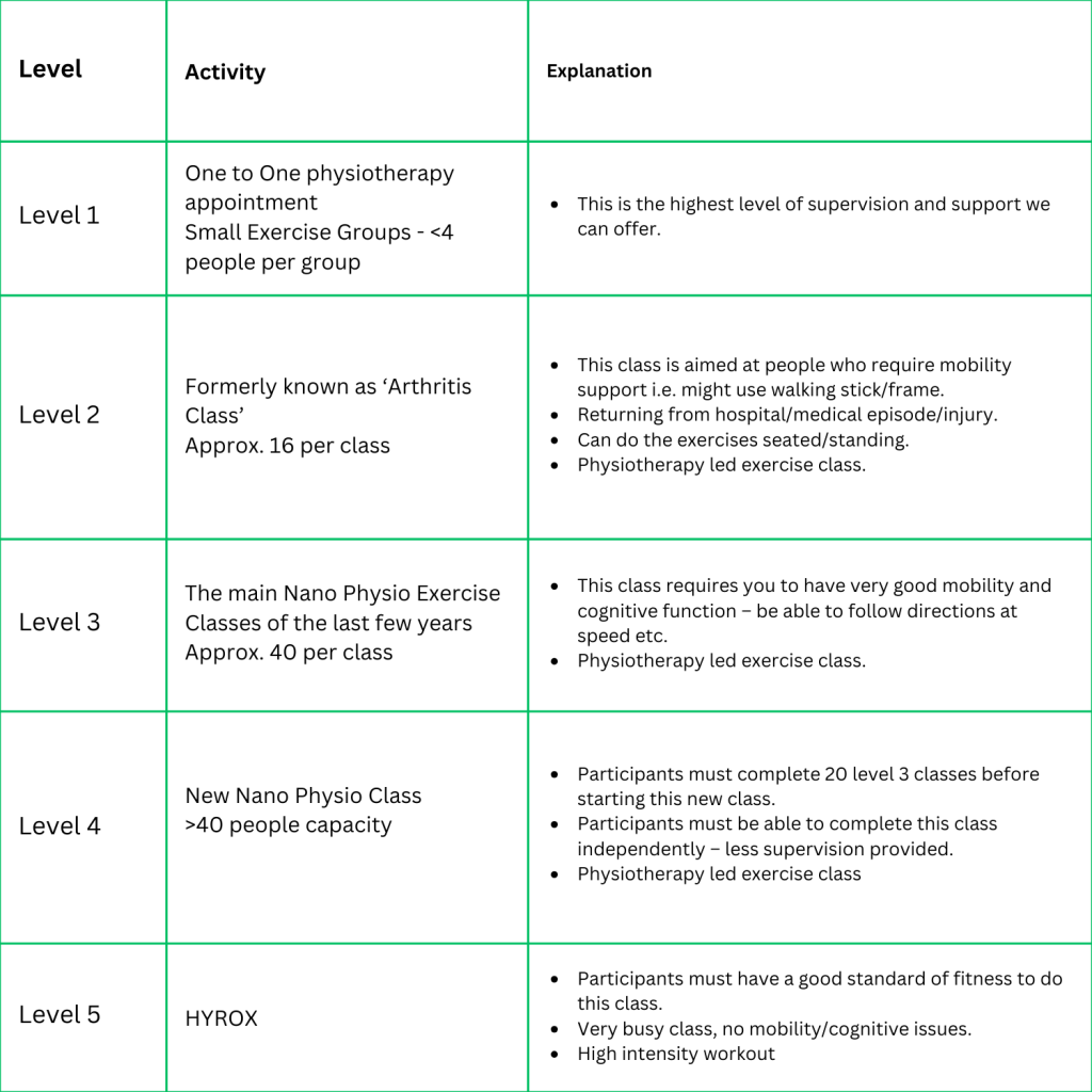 We ask all of our level 2, 3 & 4 participants to come in for a 1:1 appointment with our physiotherapist before starting any of these classes.
